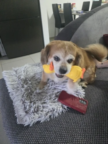 Vanesa Torphy Very pretty toy that emits a fun duck-like squeak. My dogs love it and i let him play with it only indoors because being in autumn we have huge amount of yellow leaves in the garden and it would be hard to find a yellow toy amongst the yellow leafs falling from the trees.