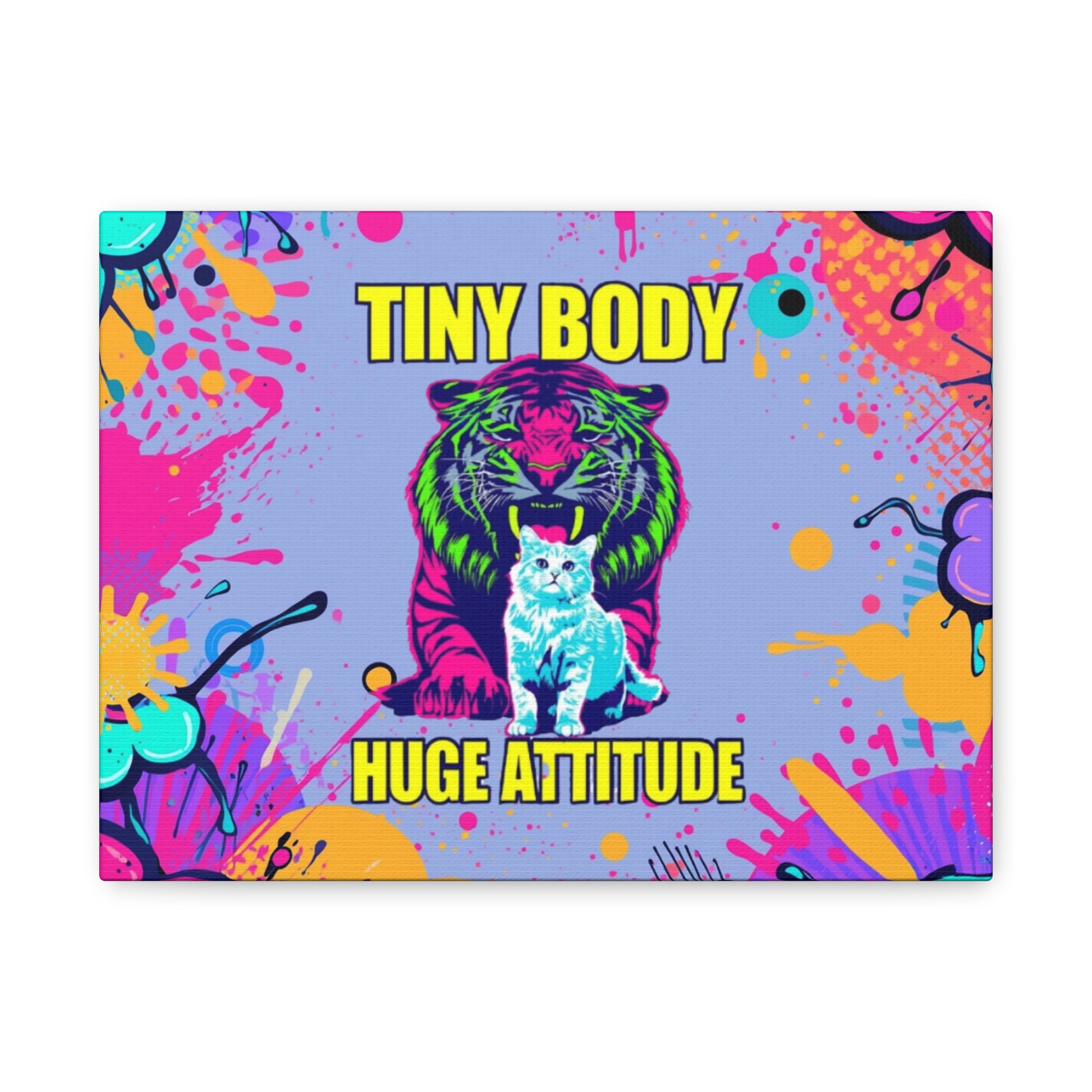Colorful cat meme wall canvas with a tiny body but huge attitude. Perfect for cat lovers and meme enthusiasts looking to add a pop of color and personality to their living space. Great for decorating a bedroom, office, or any room in need of some fun and humor. Ideal for birthdays, holidays, or just because gifts.